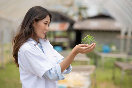 Portrait of a scientist holding cannabis seedlings, cannabis farming concept in a greenhouse. Concept of alternative herbal medicine, CBD oil, pharmaceutical industry
