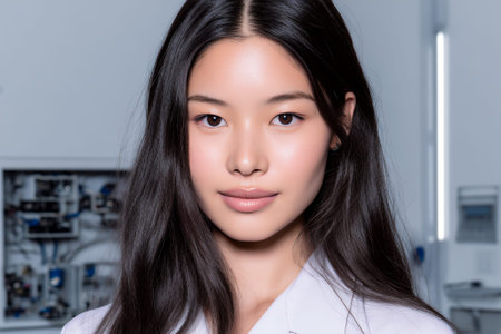 A young Asian woman with long, dark hair and a white lab coat looks directly at the camera. The background appears to be a laboratory or clean room setting with equipment visible.