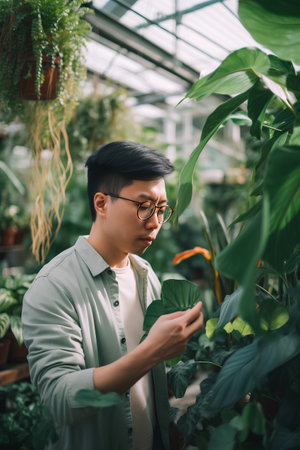 Young asian man gardener in eyeglasses checking plants in greenhouse.