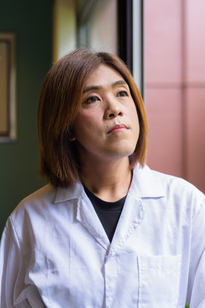 Asian transgender non binary doctor face closeup in office looking through window