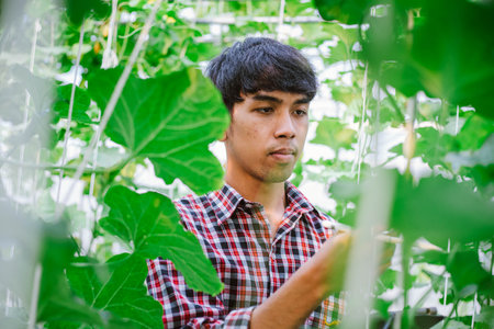 The farmer is checking the quality of the melon at the melon farm in a plastic house