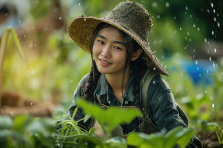 Young Woman Gardener Smiling in the Rain, Wearing a Straw Hat