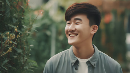 A joyful young Asian man with a warm smile is captured in a relaxed indoor environment, surrounded by soft greenery. His friendly demeanor and stylish sweater create an inviting atmosphere, perfect for conveying happiness and approachability.