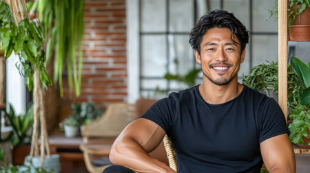 A smiling Asian man in casual black shirt surrounded by plants