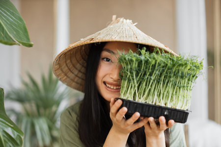 Portrait of young asian woman holding microgreen sprouts on tropical exotic background, enjoying healthy diet, indoor at background with palm leaves. Weight loss concept.