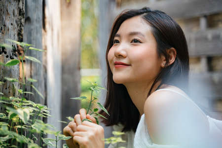 Beautiful asian woman in white dress relax and smiling in nature park. Thai girl or Chinese Girl enjoy on holiday in garden