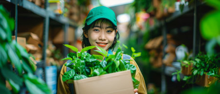 Portrait of beautiful asian woman smiling at the camera in a greenhouse.