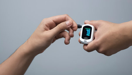 Man using finger pulse oximeter, healthcare monitoring concept. Pulse oximeter on a background