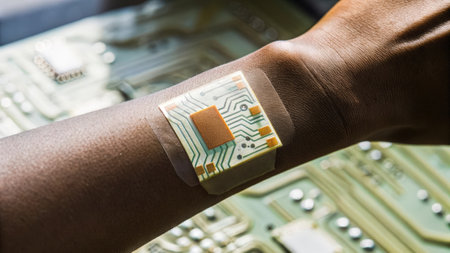 A medium closeup of a persons wrist displaying an augmented skin patch that adapts color based on temperature readings with intricate circuitry patterns visibly integrated beneath.