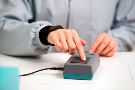 Finger pressing biometric scanner for secure identity verification in lab coat.