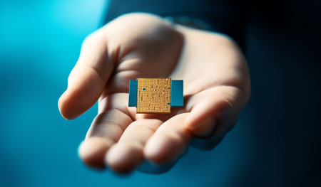 A person carefully holding a small electronic microchip with intricate designs in fingers
