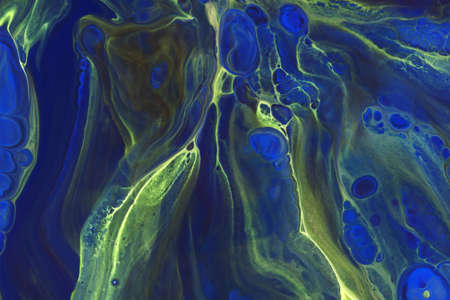 Fluid art background made of liquid. Galactic ocean with blue and green acrylic paint