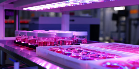 Production line pharmaceutical industry. Manufacturing of drugs and medications, pharmaceuticals. Laboratory Petri dish transparent biology plant green blue background