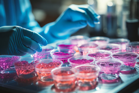 Vibrant and colorful petri dishes filled with various cultures demonstrate scientific research in a modern laboratory setting. Each dish reveals microbial growth.