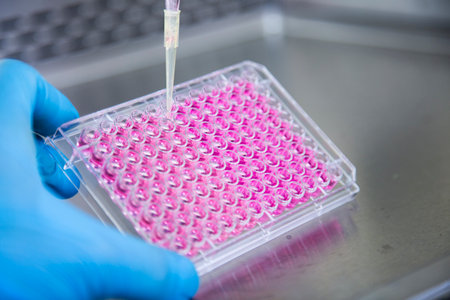 Closeup shot, Scientist use a micropipette with sample preparation for bioassay of in vitro cells on microplate, 96 well in laboratory. Medicinal, Medicine, Biochemistry research.