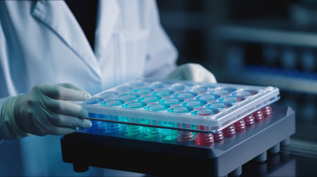 A scientists hands clad in light blue gloves carefully placing a microplate filled with samples under a bright wellplate reader emphasizing the technical precision involved in testin