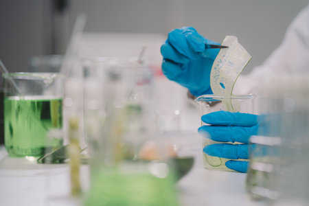 Biochemistry laboratory research, Chemist is analyzing sample in laboratory with equipment and science experiments glassware containing chemical liquid.