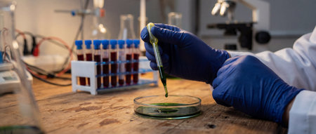 Scientist wearing blue gloves carefully using pipette to work on a petri dish placed on a wooden laboratory bench with test tubes in background for analysis