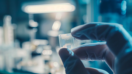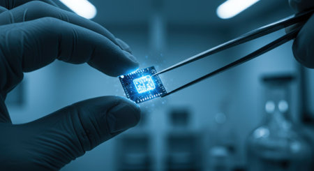 Close up of a scientist holding a glowing microchip with tweezers, showcasing advanced technology in a laboratory setting, emphasizing innovation and precision in electronics.