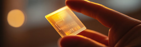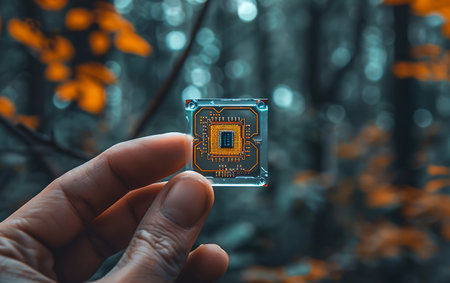 A man holding a microchip showcasing innovation in digital technology and electronics. Concept Digital Technology, Innovation, Electronics, Microchip, Man