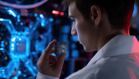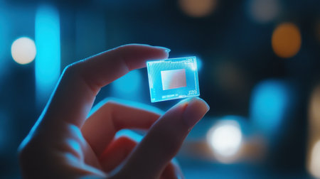 A scientist is holding a small device in his hand. The device is glowing and he is a microchip. Concept of curiosity and wonder about the technology and its potential uses