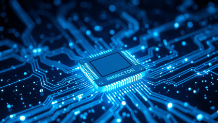 A chip core releases neon energy streams in a detailed high-tech circuit. The scene shows dynamic glowing colors.