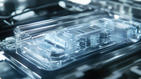 In a sterile laboratory setting, a powerful laser activates a microchip submerged in a petri dish, symbolizing a groundbreaking fusion of biology and technology.