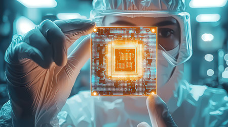 A man is holding a computer chip in his gloved hand. Concept of technology and innovation, as the man is likely a scientist or engineer working with advanced electronic components