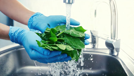Closeup of woman's hands in blue gloves washing fresh spinach leaves in kitchen sink