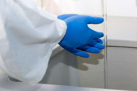 Laboratory research. Scientist conduct tests and experiments. Test tube, water and yellow rubber gloves. The working process
