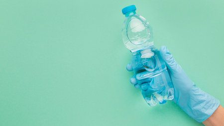 person wearing gloves holding plastic bottle