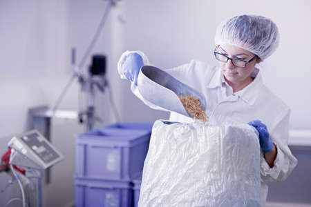 Factory worker scooping food into sack