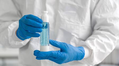 Close-up of transparent bottle with disinfectant in hands of person in black gloves and white protective suit