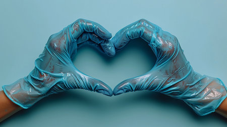 Hands in blue latex gloves forming a heart shape on blue background