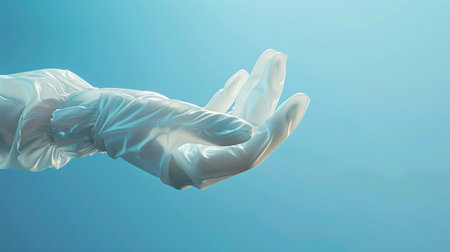 Doctor after medical procedure removes a sterile glove, close-up frame on blue background. Environmental friendliness and safety during medical procedures. Health and wellness.