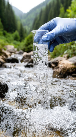 Water sampling from a crystal-clear mountain stream surrounded by lush greenery and rocky terrain on a sunny day