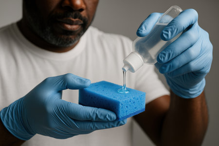 Man wearing blue gloves preparing cleaning sponge with liquid solution for effective home hygiene and sanitation tasks.