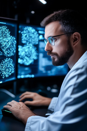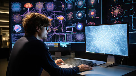 A scientist examines intricate data patterns on several screens in a dimly lit lab.