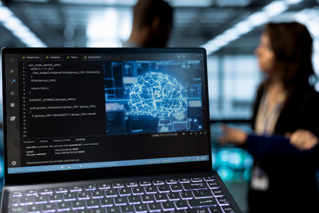 Technician and colleague use AI cognitive computing to extract information from complex data on laptop. Close up of teamworking IT experts using artificial intelligence on notebook