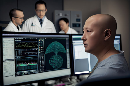 a person looking at an image on a computer screen with two other people in the photo are wearing white lab coats. Generative AI