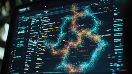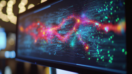 Computer screen showing futuristic data stream visualization with colorful particles flowing
