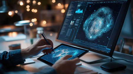It specialist designing innovative futuristic network using digital tablet and computer in office at night