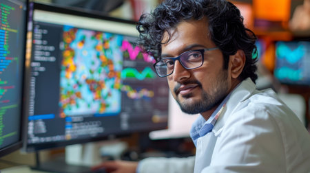 A dedicated scientist engages in data analysis in a modern laboratory. Multiple monitors display complex graphics and information, showcasing cutting-edge technology in research and innovation.