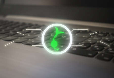 Green glowing plant growing from a seed with circuit board lines. Green technologies developing concept