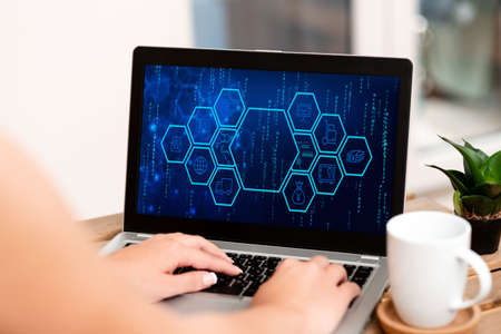 Businesswoman typing on laptop in office. Technology network illustration hologram.