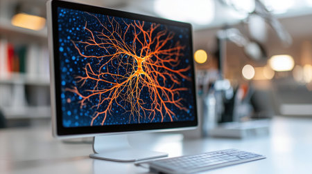 A sleek computer screen showcases a vibrant neuron network illustration in a contemporary office setting, highlighting the intersection of technology and science.