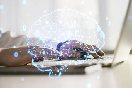 Creative artificial Intelligence concept with human brain hologram and hands typing on laptop on background. Multiexposure