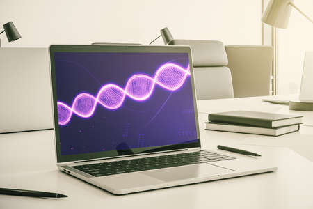 Creative DNA sketch on modern laptop monitor, biotechnology and genetic concept. 3D Rendering