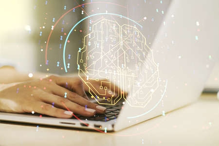 Double exposure of woman hands working on computer and brain hologram drawing. Ai concept.