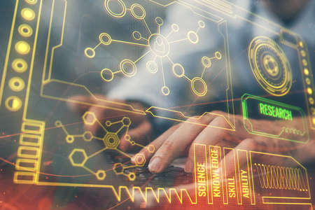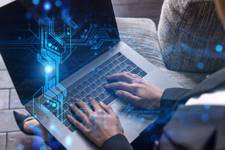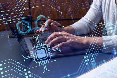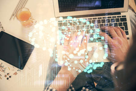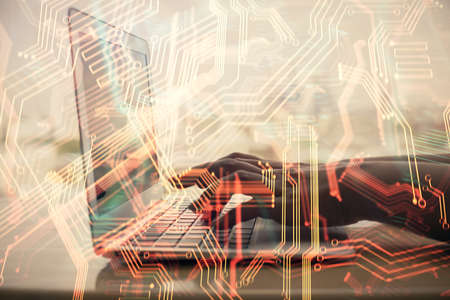 Double exposure of circuit hologram and hands typing on laptop on background. Research and development hardware concept